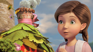 Tink (voice of Mae Whitman) before she meets Peter! Tink and her friend arrive on a beautiful summer’s day to Fairy Camp, hidden in a large tree – so the humans won’t see them. Tink is told by all her friends that she HAS to stay hidden in Fairy Camp. “It’s like all of Pixie Hollow under one tree!” Tink exclaims when she arrives at the coolest scene a fairy could imagine! She runs into her favorite firefly Blaze when she arrives, along with bees and friends and all kinds of fairy activities. The fairies are engaged in making Queen Anne’s lace and are using a contraption that Tink invented to have bees harvest their own honey into pots. Tink keeps looking for things to fix, but nothing is broken and she starts to feel a little daunted that she can’t HELP anyone fix something. Iridessa warns Tink to STAY AWAY from the HUMAN’s HOUSE, not far away. A storm is coming, say the fairies, as they all hide under blossoms and leaves. But it’s not a storm – it’s a car with – yes! – two humans in it, a big human endologist father (voice of Michael Sheen) and his little girl, Lizzy (voice of Lauren Mote). Tink flies away to follow the car to the house, and overhears the father telling Lizzy that they are back at their summer cottage. But Tink is so amazed at the car that she HAS to find out how it works. Another fairy from the Fairy Camp, Vidia, flies down to get Tink to safety.