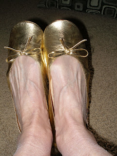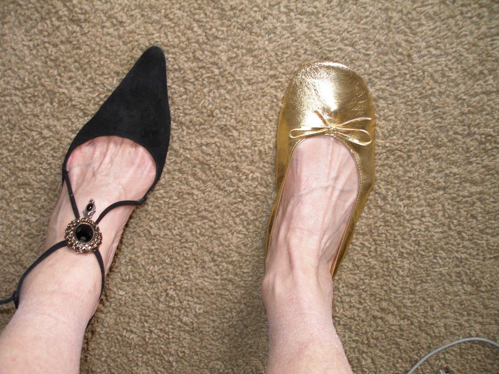 So when my gold FootzyRolls came in their little canister, with their own little black clutch bag (about 5″ 3″) I decided to go for the GOLD! My FootzyRolls fit perfectly, and were comfortable beyond belief! Just one note: the tips of the FootzyRolls will rise up a bit on the toe from being packed in their little clutch container, but that goes away after one wearing!