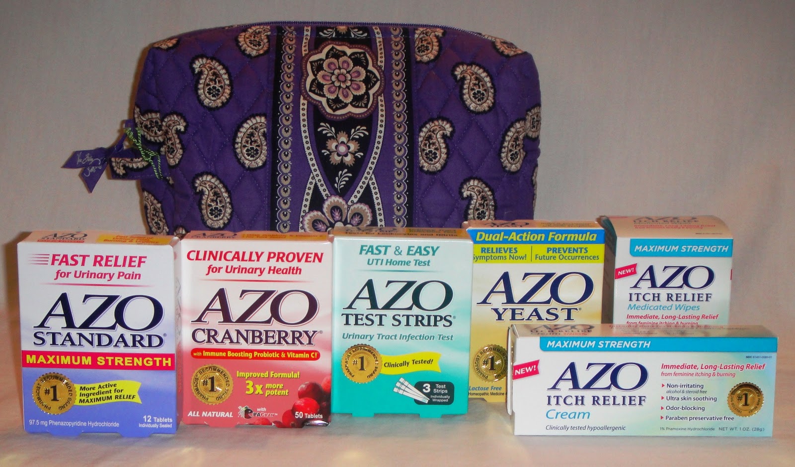 The AZO products WORK. I take the cranberry tablets daily. I also take the AZO yeast, because once a yeast infection comes to visit, it’s like an unwanted relative – it STAYS way beyond the time you need to deal with it! Since I go up to the mountains on the weekends to my friend’s cabin, I carry my AZO products in my darling little bag and I am confidentially prepared for ANYTHING (well, the bear visiting the garbage can was a little out of the ordinary, but…).