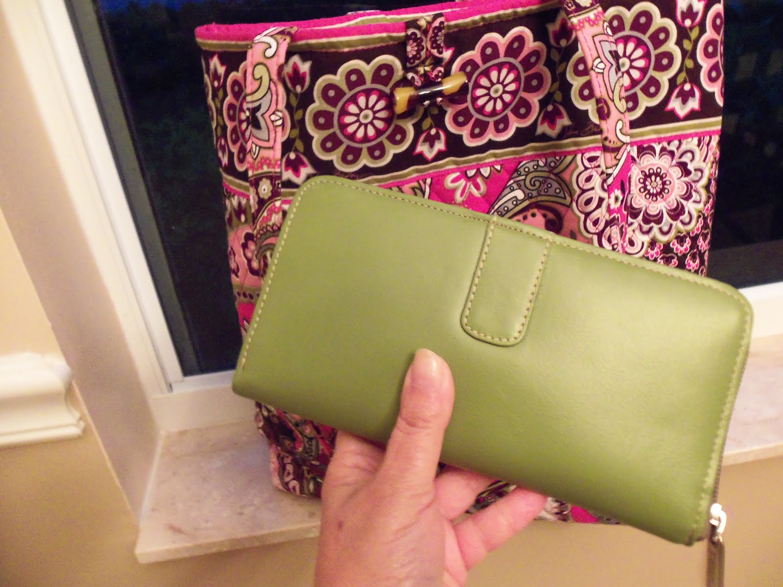 And yes, I took the leap and ordered.an apple green wallet. Hey, I had been given a pink & green Vera Bradley bag full of swag at BlogHer a few weeks ago from The Product Review Place, so I NEEDED a matching wallet (Broad “A” is at home laughing as she reads that I’m sure).